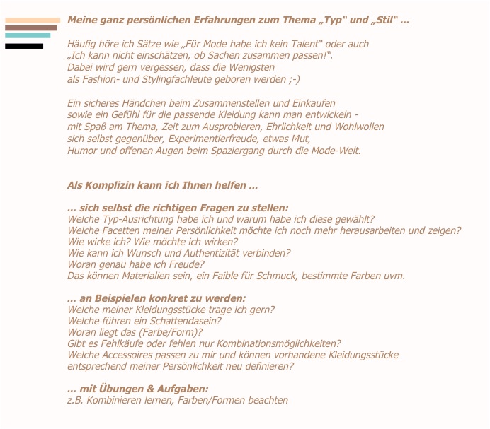 Gespräche über Ihre Wünsche und Vorstellungen, umfangreiches Ausprobieren mit vielen Anregungen und ein ehrliches Feedback lassen Sie zu einer offenen, (selbst)bewussten und zielgerichteten Einkäuferin in eigener Sache werden, die wirklich weiß, was ihr steht und vor allem: Woran sie Spaß hat!